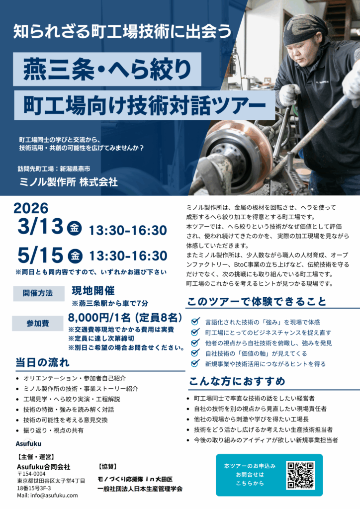 本ツアーも共創の場の提供の一環として開催を予定しており、今回は燕三条でも数少ない伝統工芸「へら絞り」を得意とする町工場、ミノル製作所を訪問します。